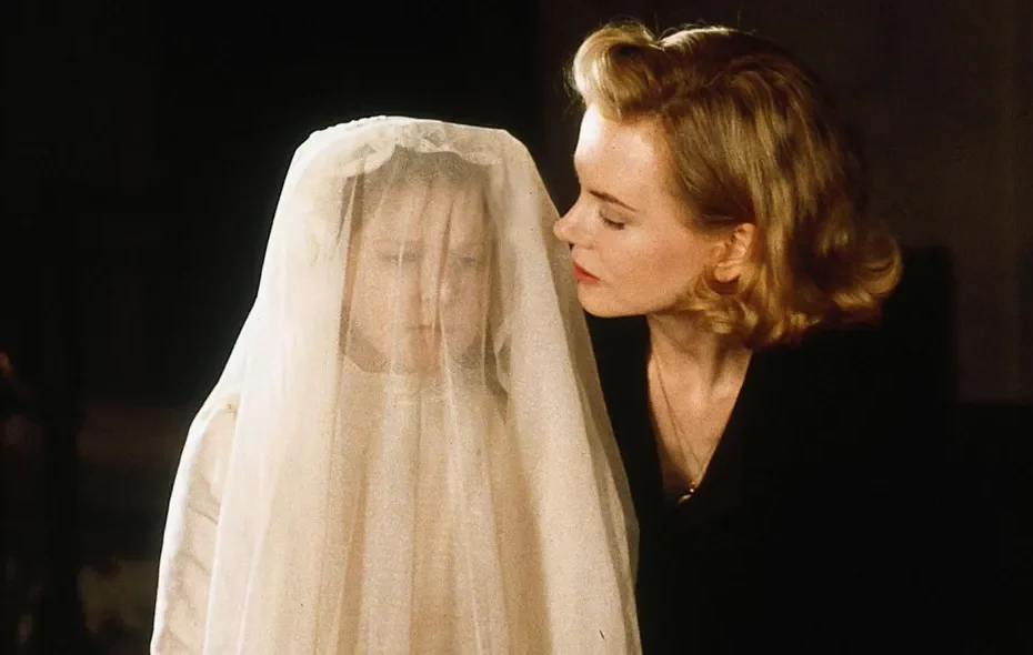 Ogni dialogo sulla fede, ogni insistenza sul buio, ogni gesto di controllo materno è un indizio che acquista senso solo alla fine. La rivelazione conclusiva non ribalta soltanto la prospettiva narrativa, ma trasforma il film in una riflessione sul lutto e sulla negazione. Grace è una figura rigidamente religiosa, ossessionata dall’ordine e dalla disciplina. Impone ai figli un’educazione severa, parla continuamente di peccato e punizione. In superficie, sembra la tipica madre vittoriana fuori tempo massimo, ma il film dissemina indizi psicologici più sottili. Dalla sua paura del mondo esterno, all’angoscia per l’assenza del marito disperso in guerra. La casa diventa una fortezza mentale prima ancora che fisica.