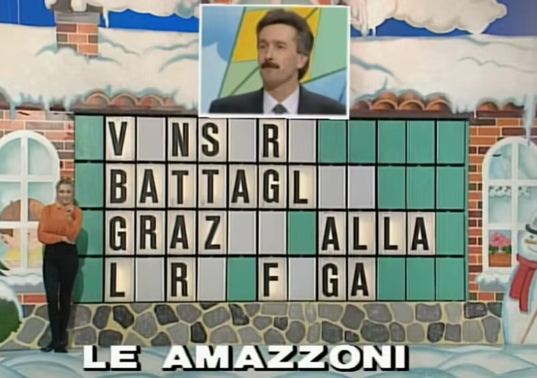 - Alcuni li abbiamo già citati: Non è la Rai, altro elemento che fa pensare immediatamente agli anni Novanta quanto pochissime altre cose, si concluse nel 1995. Casa Vianello, cult televisivo, andava in onda all’ora di pranzo. Tanto per continuare sulla linea dei déjà vu, La Ruota della Fortuna, in onda alle 19.00, era uno dei programmi di maggiore successo di Canale 5 ed era condotto da Mike Bongiorno. Indimenticabile la puntata del 13 marzo: in quel momento, infatti, il signor Giancarlo scrisse la storia della televisione con una risposta leggendaria sul tema “Le Amazzoni”. Secondo lui, infatti, “vinsero battaglie grazie alla loro… f**a”. Sì, grazie alla loro foga. Ora che ci penso, voglio la maglietta con quel tabellone.
