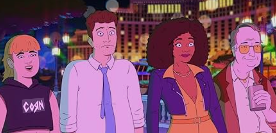 Il Lincoln di Scott funziona grazie a un deadpan controllato e nevrotico. Sheila, al contrario, vive dell’energia imprevedibile portata da James. Quando la serie rallenta la raffica di gag (qui il commento a una gag di Seinfeld) e lascia spazio ai personaggi, emergono momenti molto efficaci. È in queste pause che si intravede il potenziale character-driven dello show, che, se sviluppato meglio, potrebbe diventare il punto di forza in futuro. Più deboli, invece, risultano i comprimari, poiché restano funzionali alle battute e la loro tridimensionalità è ancora limitata. Sul piano visivo, invece, la produzione di Titmouse si conferma coerente con gli standard attuali dell’animazione occidentale. La palette neon restituisce bene l’eccesso di Las Vegas, con i character design espressivi e la regia che privilegia i movimenti nervosi a sostegno del ritmo. Nonostante ciò, manca ancora a Strip Law una firma stilistica riconoscibile, e questa neutralità potrebbe diventare un limite strutturale.